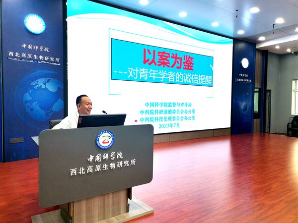 為深入開展學(xué)習(xí)貫徹習(xí)近平新時(shí)代中國(guó)特色社會(huì)主義思想主題教育,進(jìn)一步加強(qiáng)研究所科研誠(chéng)信建設(shè),教育引導(dǎo)科研人員和研究生遵守科研規(guī)范、增強(qiáng)誠(chéng)信自律,共同傳承中國(guó)科學(xué)院優(yōu)良傳統(tǒng)。7月19日下午,中國(guó)科學(xué)院科研誠(chéng)信宣傳教育專題講座在中國(guó)科學(xué)院西北高原生物研究所舉行。中國(guó)科學(xué)院蘭州分院紀(jì)檢組組長(zhǎng)、分黨組成員、系統(tǒng)單位紀(jì)委書記吳建剛,中國(guó)科學(xué)院巡視辦整改督辦室負(fù)責(zé)人程海濤,中國(guó)科學(xué)院西北高原生物研究所和青海鹽湖研究所的所領(lǐng)導(dǎo)、科研人員、特別研究助理、在學(xué)研究生等100余人參加報(bào)告會(huì)。報(bào)告會(huì)由西北高原所所長(zhǎng)陳世龍主持。