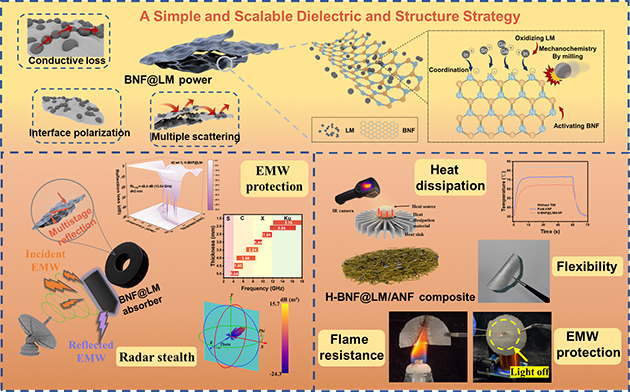近期,針對(duì)傳統(tǒng)h-BN改性方法工藝復(fù)雜和環(huán)境負(fù)荷大的問題,研究團(tuán)隊(duì)提出了一種簡(jiǎn)易且可擴(kuò)展的機(jī)械力誘導(dǎo)活化改性策略,調(diào)控h-BN的導(dǎo)熱和吸波性能。該研究利用液態(tài)金屬(LM)的流動(dòng)性及其高導(dǎo)電特性,通過機(jī)械過程讓LM與BNFs充分接觸并發(fā)生反應(yīng),從而活化BNFs表面,引入豐富的界面極化中心和缺陷位點(diǎn)(BNF@LM)。優(yōu)化后的BNF@LM復(fù)合材料在維持高效吸波性能的同時(shí),能夠與芳綸納米纖維復(fù)合制成柔性復(fù)合薄膜,展現(xiàn)出優(yōu)異的熱管理及良好的阻燃性能,確保了材料在極端環(huán)境下運(yùn)行的可靠性。相關(guān)研究結(jié)果發(fā)表在Journal of Advanced Ceramics (2025,14,9221208) 上。