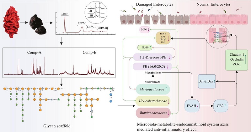 在慢性束縛壓力誘導的小鼠腸道炎癥模型中,活性最優(yōu)的果膠組分(LBPA-III,100 mg/kg.bw)可顯著減輕結腸組織損傷,恢復細胞因子平衡(如TNF-α水平降低、白介素IL-10水平升高),并抑制中性粒細胞浸潤。機制層面,LBPA-III通過重塑腸道菌群結構(如降低Helicobacteraceae豐度、升高Muribaculaceae豐度)、下調促炎脂質代謝物(如1,2-dierucoyl-PE)水平,以及調控內源性大麻素系統(tǒng)(如CB2水平升高、FAAH水平降低)發(fā)揮抗炎作用。上述研究揭示,枸杞果膠AG-II與RG-I–AG-II這種獨特的結構范式,通過“超分子偽降解”機制協(xié)同調控腸道菌群,并激活“腸道菌群-代謝物-內源性大麻素系統(tǒng)”軸,從而高效抑制腸道炎癥。