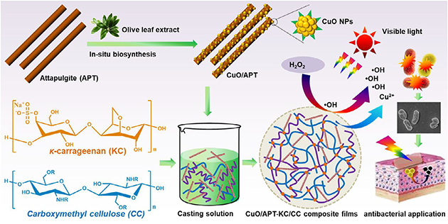 圖4.CuO/APT-KC/CC凝膠膜敷料的制備和抗菌應(yīng)用示意圖