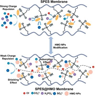 研究團(tuán)隊(duì)設(shè)計的SPES@HMO氯離子膜,利用磺化聚醚砜(SPES)基質(zhì)含有高密度的帶負(fù)電磺酸基團(tuán)(-SO3H),通過介電排斥作用阻礙陰離子的傳輸。同時,水合氧化錳(HMO)納米顆粒在SPES基質(zhì)中均勻分散,通過電荷屏蔽效應(yīng)調(diào)節(jié)界面電荷環(huán)境,從而增強(qiáng)氯離子的滲透性,實(shí)現(xiàn)了靜電調(diào)控和競爭性吸附相結(jié)合的作用機(jī)制。實(shí)驗(yàn)結(jié)果表明,這種協(xié)同機(jī)制顯著提升了氯離子的選擇性。在Cl-與CO32-的分離測試中,氯離子通量維持1.30×10-3 mol·m-2·min-1時,膜的離子選擇性高達(dá)1295.36。該技術(shù)的開發(fā)對鹽湖高純產(chǎn)品開發(fā)具有重要意義,同時該膜還可應(yīng)用于工業(yè)廢水處理和海水淡化等領(lǐng)域,實(shí)現(xiàn)特定離子的精準(zhǔn)分離。