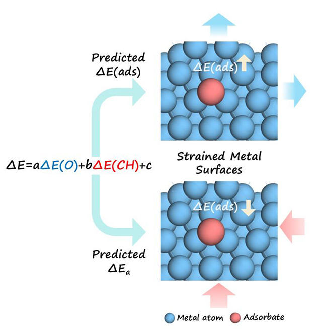 在多相催化反應(yīng)中,活性金屬表面的電子結(jié)構(gòu)對(duì)反應(yīng)物分子的吸附與活化轉(zhuǎn)化起著關(guān)鍵作用。近年來(lái)的研究表明,通過(guò)對(duì)金屬晶格施加拉伸或壓縮應(yīng)變,可有效調(diào)控其表面電子結(jié)構(gòu),顯著改變反應(yīng)物及關(guān)鍵中間體的吸附行為,進(jìn)而實(shí)現(xiàn)對(duì)催化活性與選擇性的精準(zhǔn)調(diào)控。目前,應(yīng)變工程已成為設(shè)計(jì)高性能催化劑的重要策略。然而,不同金屬體系和不同吸附物對(duì)應(yīng)變呈現(xiàn)出復(fù)雜且差異化的響應(yīng)規(guī)律,至今仍缺乏可定量描述應(yīng)變誘導(dǎo)能量變化的普適性標(biāo)度關(guān)系,制約了高效催化劑的理性設(shè)計(jì)與精準(zhǔn)構(gòu)筑。