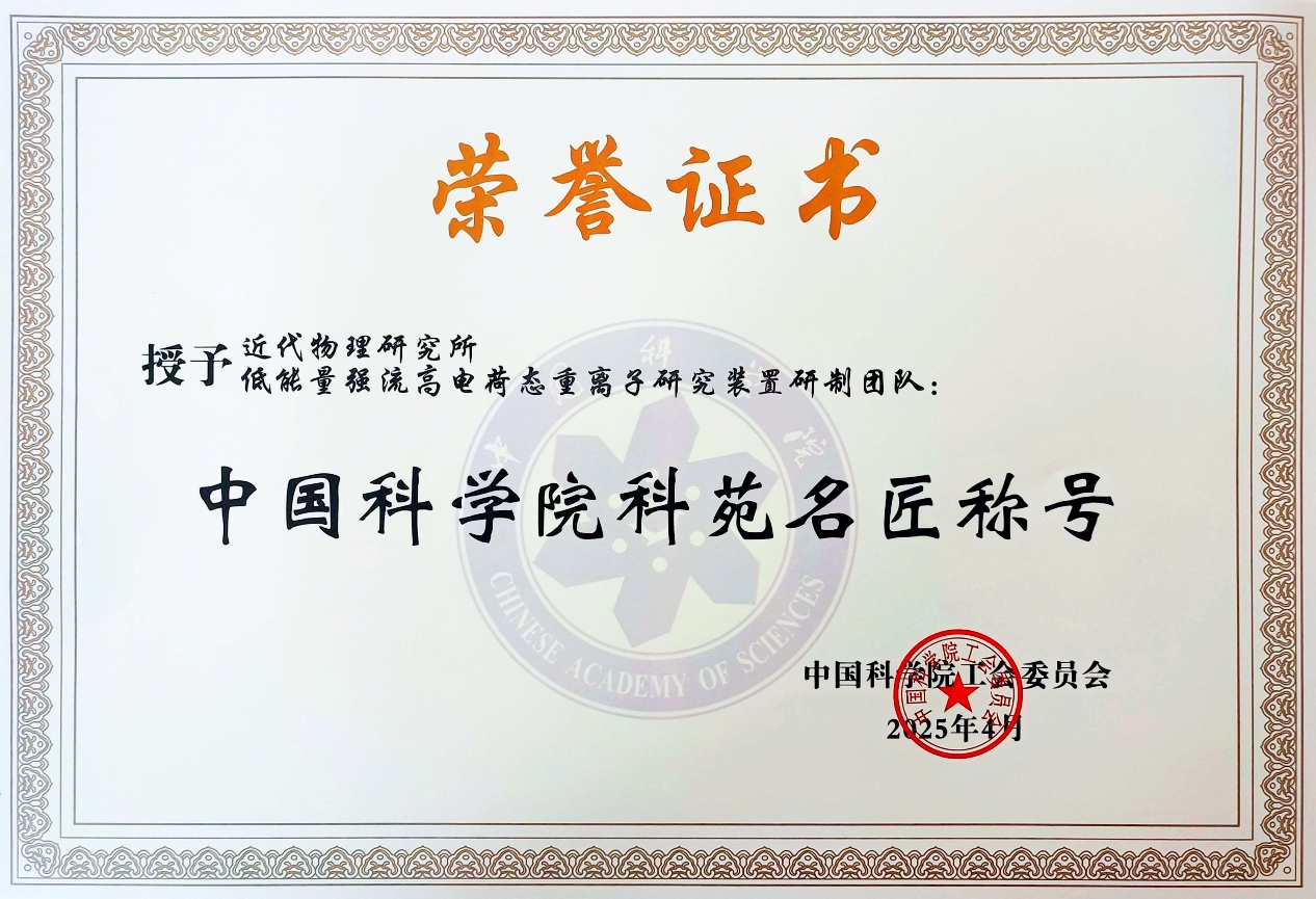 近代物理所低能量強流高電荷態(tài)重離子研究裝置研制團隊榮獲中國科學院第六屆“科苑名匠”稱號